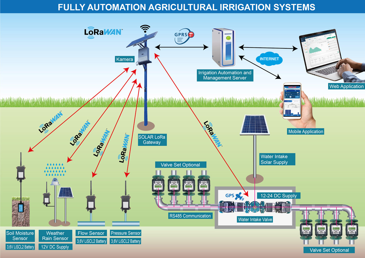 LORA AND LORAWAN Baylan irrigation meters have an internal LoRa communication system on them. It has the feature of remote management with LoRa. LoRaWAN network must be installed for Remote Management operations. Irrigation Meters communicate with central servers through LoRaWAN Gateway Devices. LORA SYSTEM LoRaWAN Gateway Devices transmit the data from irrigation meters to the BMS system. If there is a work order sent to the irrigation meter on the BMS system, it is automatically transmitted to the meter.